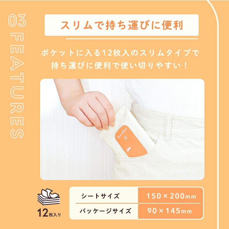 ●見えない場所で、スマートに汗も気持ちもリセット!トイレに流せるボディシートです。 ●水に流せる水解紙なので、トイレの個室で使用し、そのまま流すことができます。 ●デリケートゾーンシートでも使用している、肌にやさしいやわらかい素材を採用。 ●手のひらに持てる、丁度良い150×200mmサイズ。 ●ポーチやかばん、ポケットに入るスリムタイプ。 ●保湿成分のヒアルロン酸Na配合。 ●シトラスの香り ●日本製