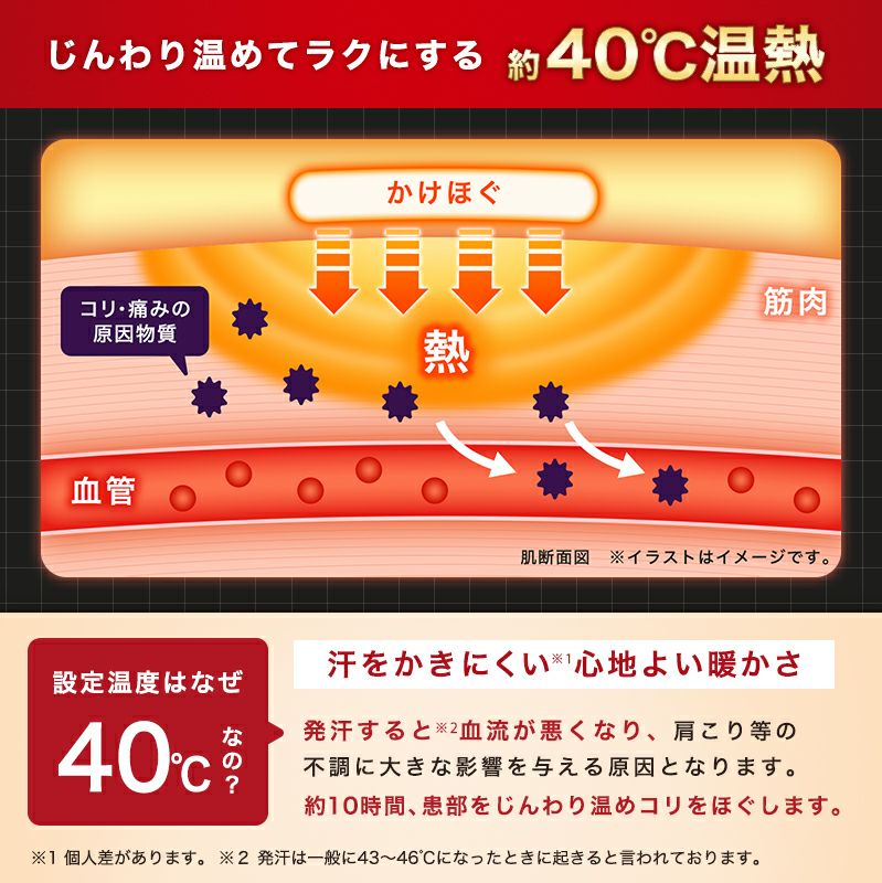 貼らない温熱シート家事・育児、長時間のデスクワークやスマートフォンの使用で凝り固まったツラい首・肩こりに。 血行改善・神経の緩和肩コリをほぐす 首肩に関するアンケート 肩にかけるだけでコリをほぐす 蒸しタオルのような心地よい温度が約10時間持続 貼らないでかけるだけで着脱自由 家事や仕事をしながら肩コリをほぐす 開発者メッセージ 忙しい働く世代の肩コリに