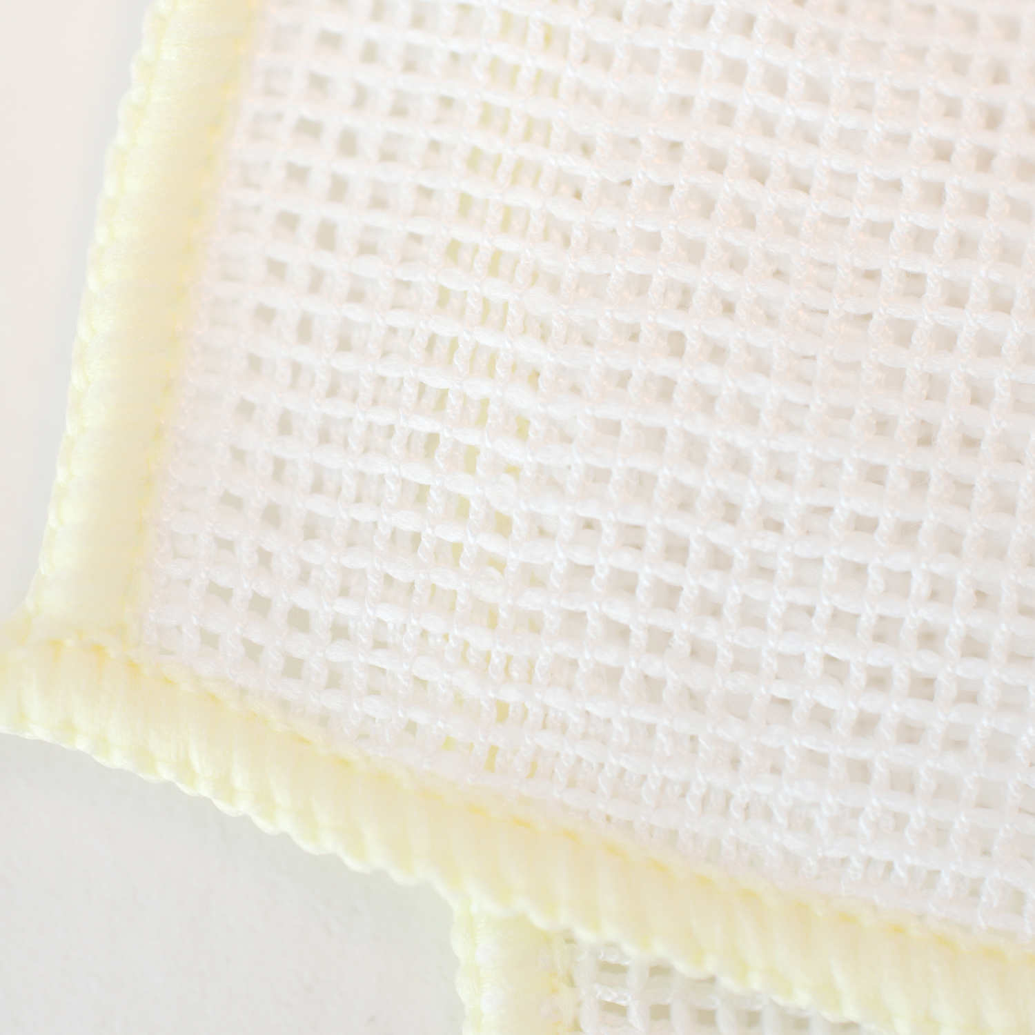 清潔感のある白いふきんに、さり気ないレモンイエローのふちどりをあしらいました。シンプルで明るい配色で、キッチンになじみながらもアクセントになります。