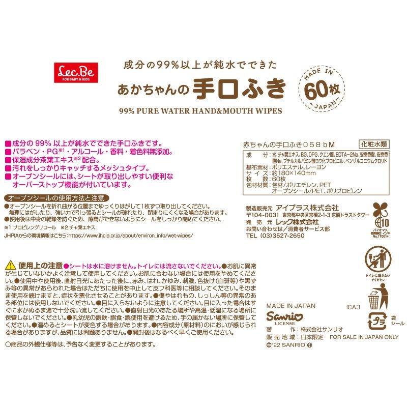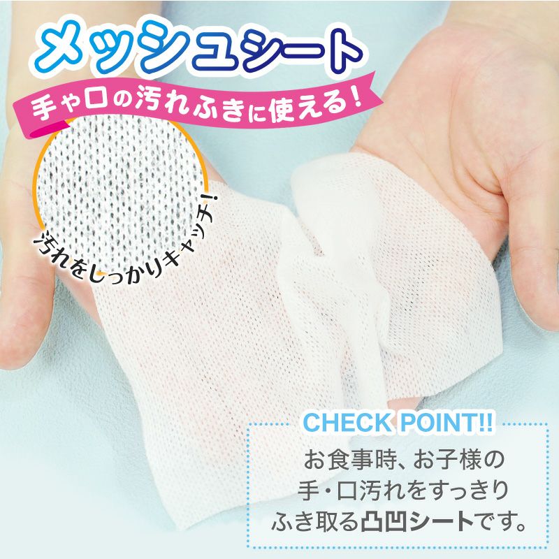 ●成分の99%以上が純水でできた安心手くちふきです。 ●生産開始からパッケージまで、人の手が一切触れずに製造。徹底的に衛生管理された日本国内の自社工場でつくられています。 ●うるおい保湿成分緑茶エキス配合。 ●汚れをしっかりキャッチするメッシュタイプのシートです。 ●便利なオーバーストップ機能がついたフラップシールなので、片手でシートが取り出しやすいです。