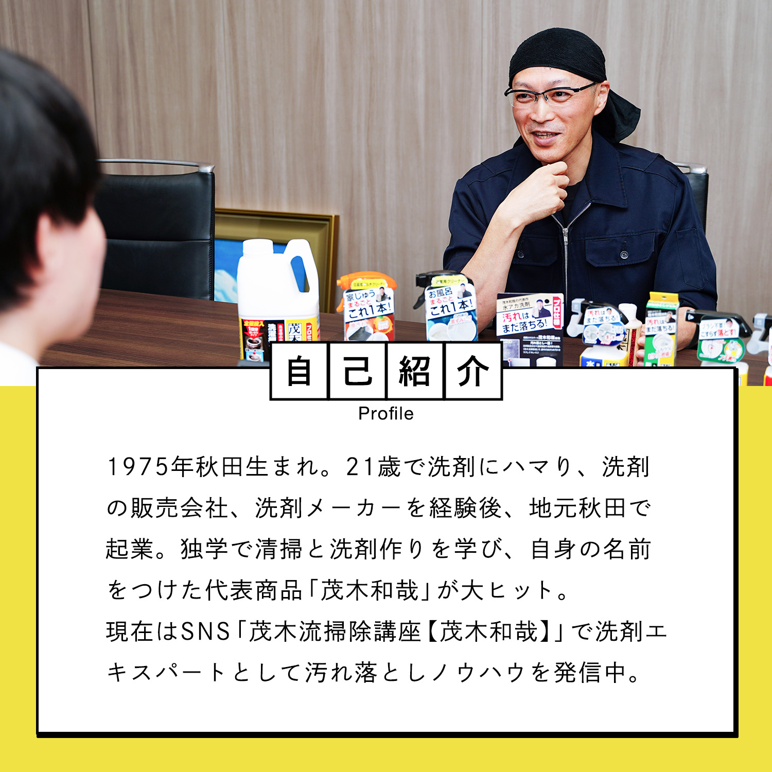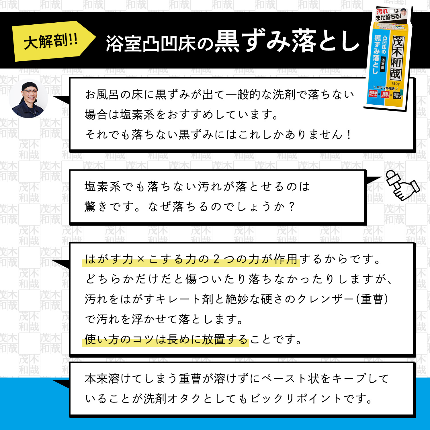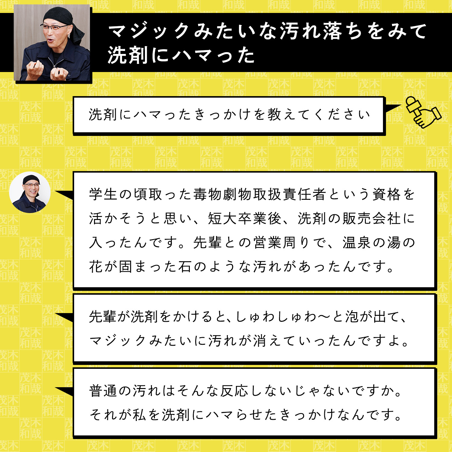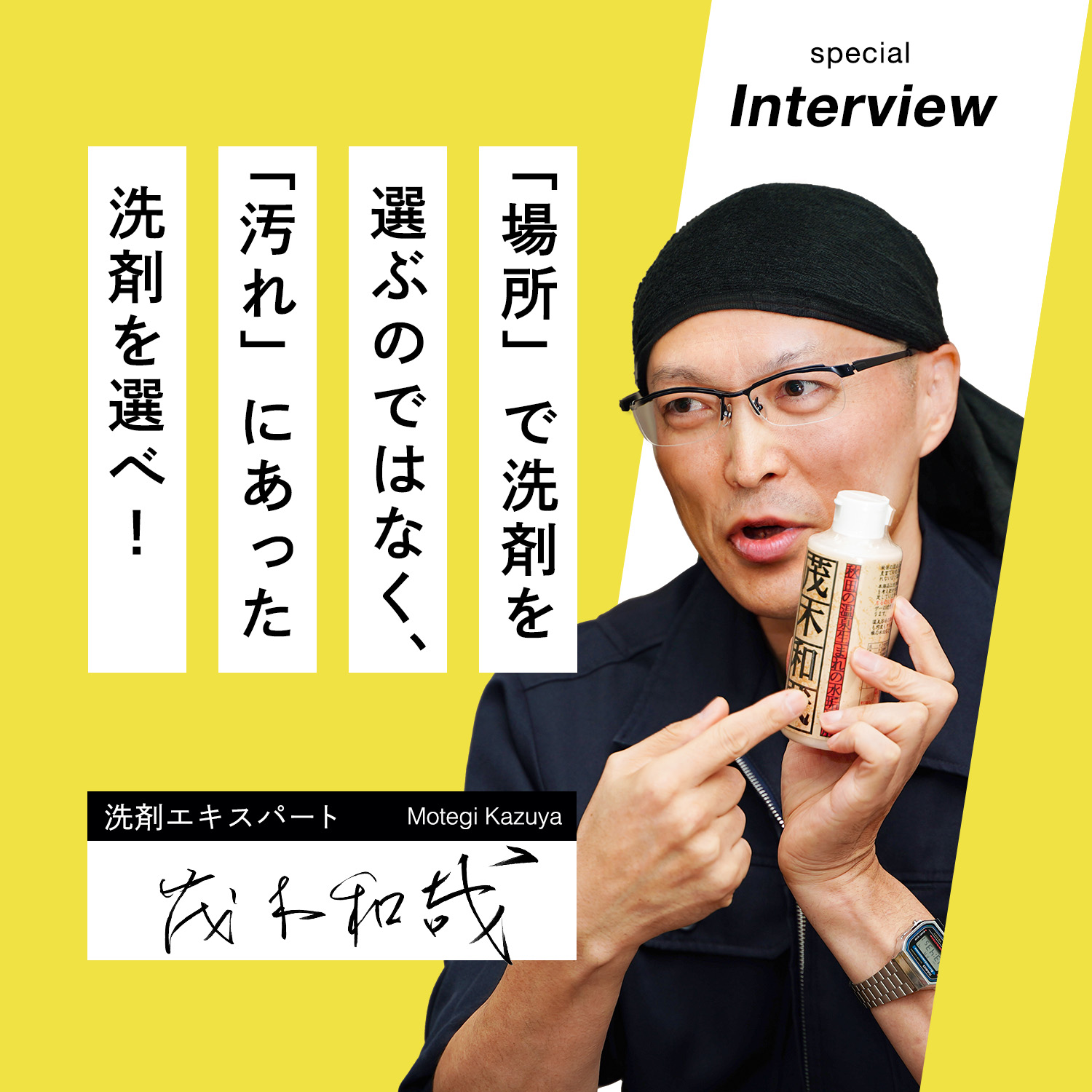 汚れ落とし一筋! 洗剤製造会社や温泉施設の清掃業を経て温泉施設のガンコな水アカも落とすオリジナルの洗剤作りをはじめる。その後自分の名前をつけた洗剤「茂木和哉」が大ヒット!洗剤を知り尽くした「洗剤のエキスパート」です。