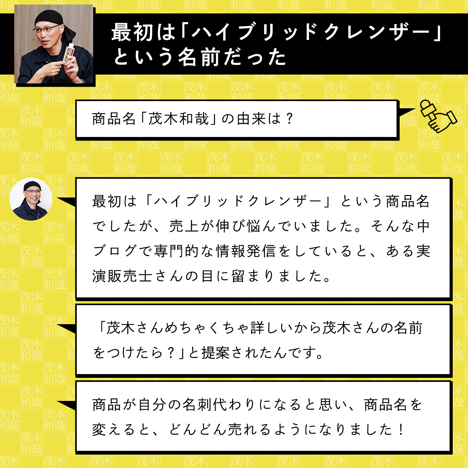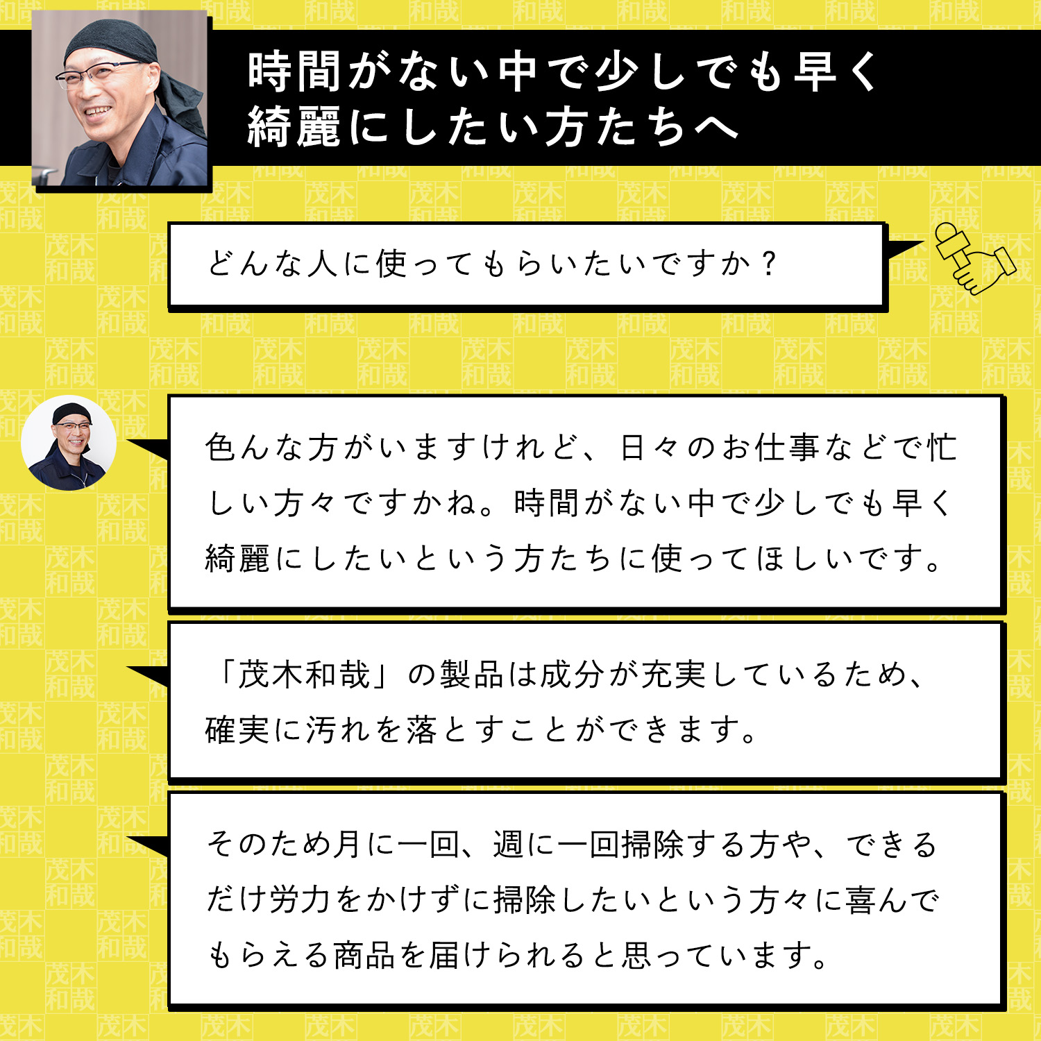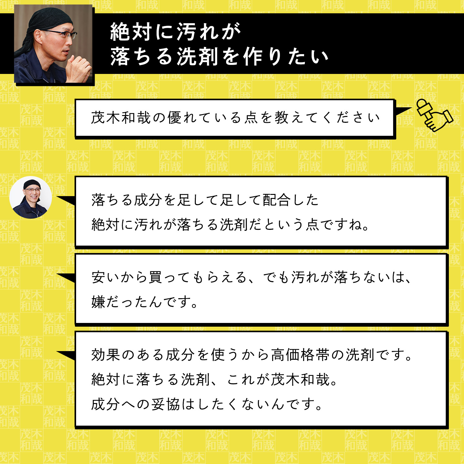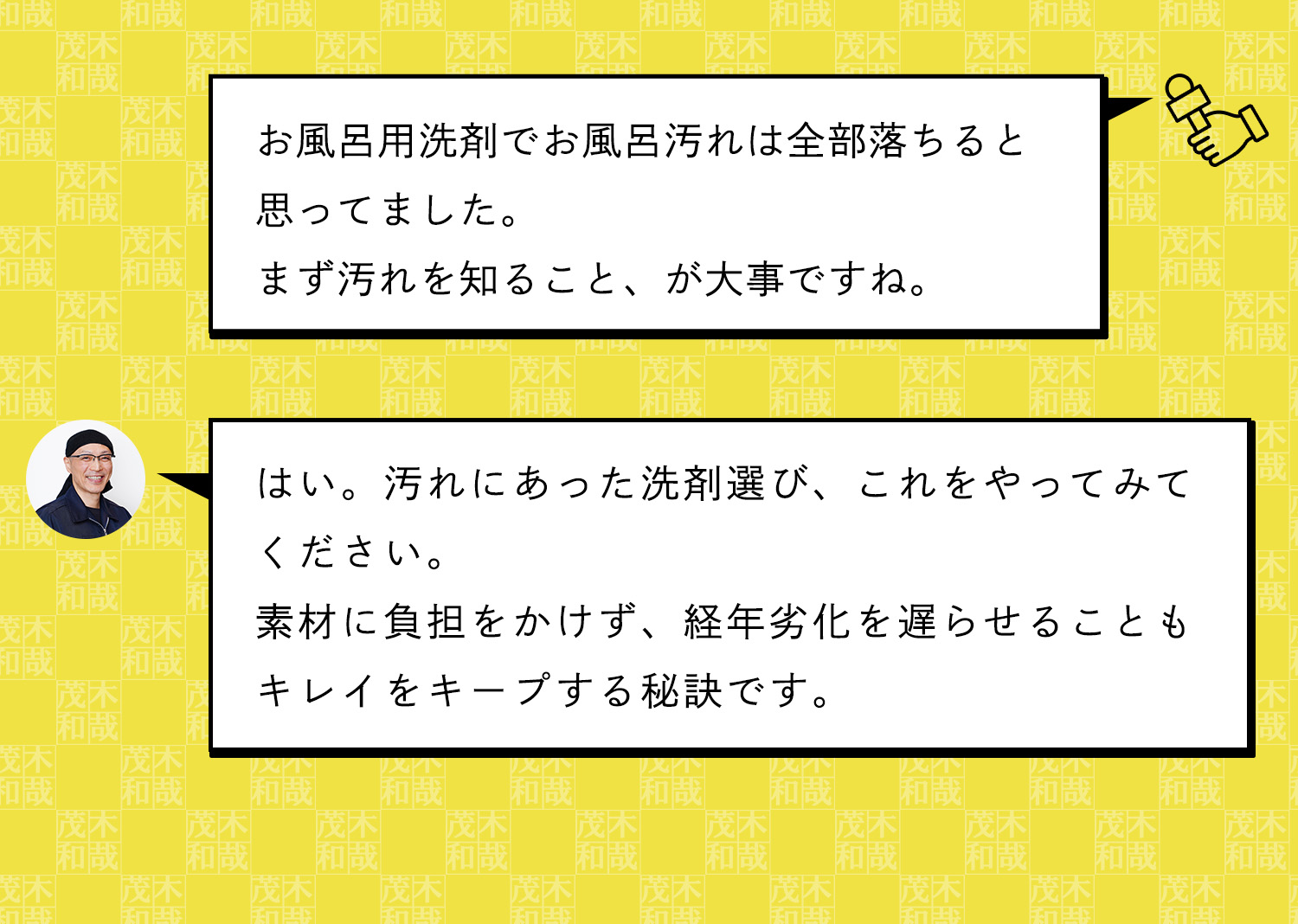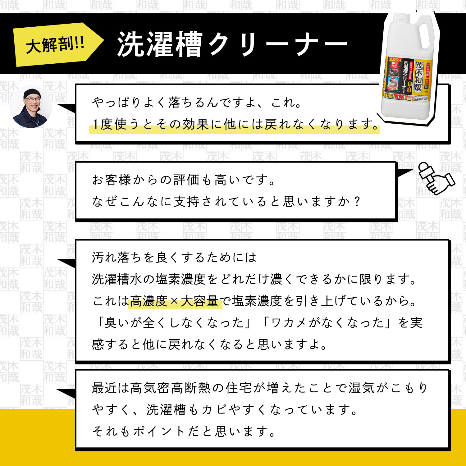 汚れ落とし一筋! 洗剤製造会社や温泉施設の清掃業を経て温泉施設のガンコな水アカも落とすオリジナルの洗剤作りをはじめる。その後自分の名前をつけた洗剤「茂木和哉」が大ヒット!洗剤を知り尽くした「洗剤のエキスパート」です。