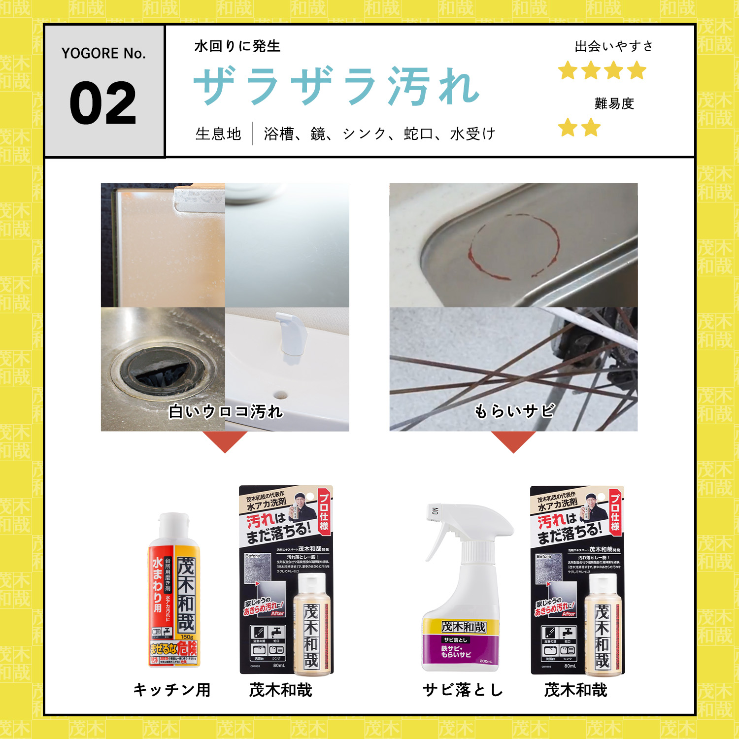 「茂木和哉」からさらにパワーアップさせた洗浄力をもつ洗剤です。「蓄積された頑固な水アカ汚れを落としつつ傷つきにくい」を目指して設計しており、茂木和哉シリーズ史上最大の研磨材量を配合(約60%)。研磨材×強酸性の中和作用で、パワフルかつスムーズに水アカを除去します。