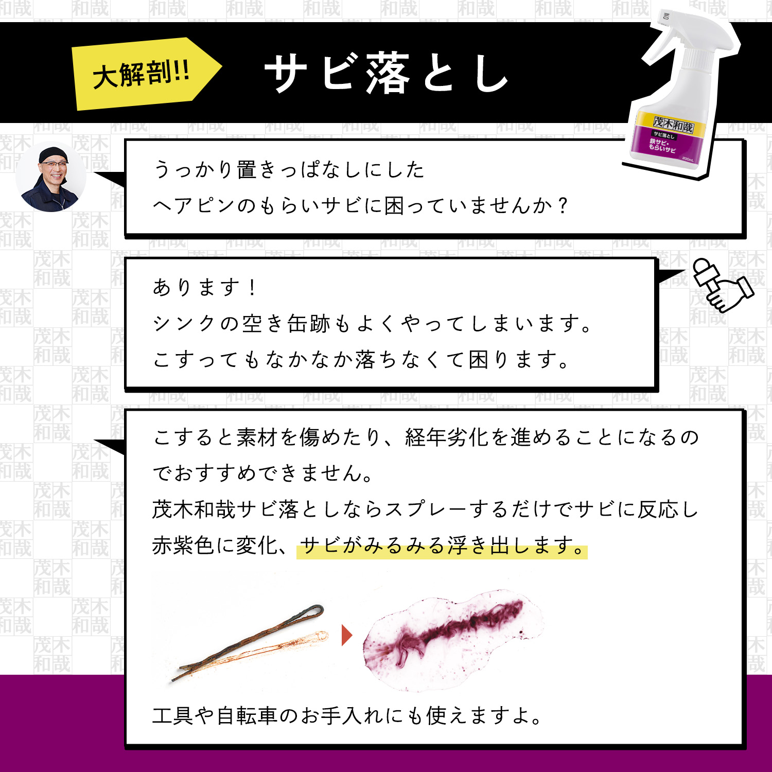 キッチンに付着した空き缶のもらいサビ、洗面台に付着したヘアピンのもらいサビの他、動かしにくくなった工具や自転車のお手入れにも使えます。従来のサビ取り剤より臭いが少ない低臭タイプです。スプレーをするだけで、サビに反応、赤紫色に変化してサビがみるみる浮き出します。