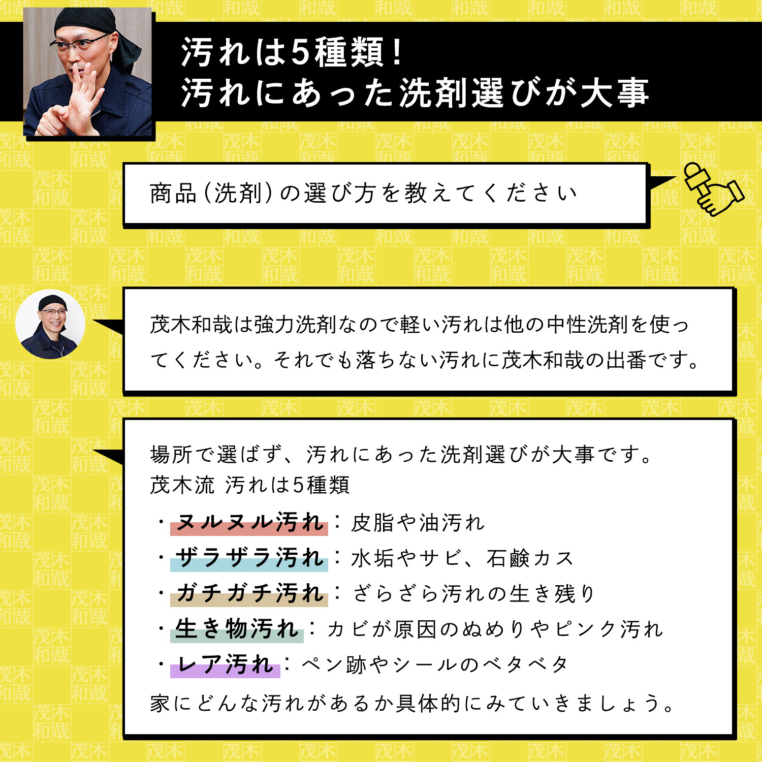汚れ落とし一筋! 洗剤製造会社や温泉施設の清掃業を経て温泉施設のガンコな水アカも落とすオリジナルの洗剤作りをはじめる。その後自分の名前をつけた洗剤「茂木和哉」が大ヒット!洗剤を知り尽くした「洗剤のエキスパート」です。