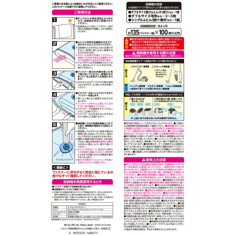 他の画像を見る 送料無料 圧縮袋フィルムの内側層に、2種類の薬剤!ワイドなクッションが色々なノズル形状にフィット。 バルサン 両掃除機対応 毛布・タオルケット 圧縮袋 2枚入 ¥ 1,680 税込 お気に入りに登録する